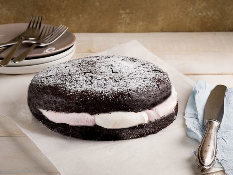 8. Ilınan keki ortadan ikiye kesin, arasına marshmallow ilave edip, diğer parça ile üzerini kapatın..