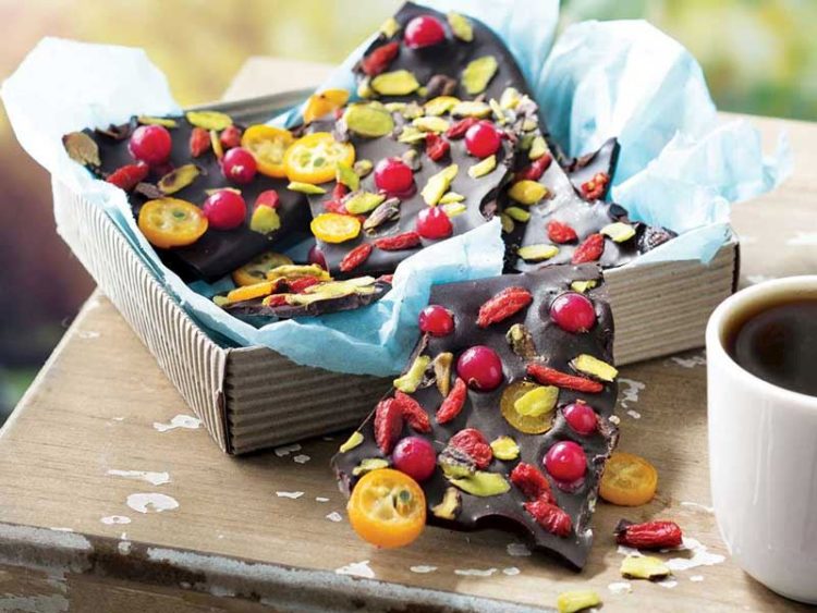 - Çikolatalar ha?f donmaya başlayınca Antep fıstığı içi, dilimlenmiş kumkuat, goji berry ve frenk üzümü tanelerini dekoratif bir şekilde çikolataya hafifçe bastırarak yerleştirin..