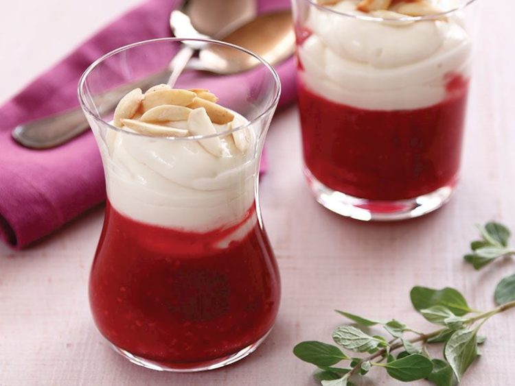 - Servis bardaklarına ahududu püresini paylaştırın..