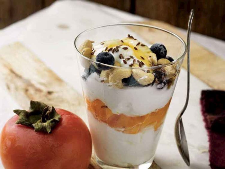 - Üzerine doğranmış cennet hurması, 4-5 tane yaban mersini ve iri kırılmış kaju fıstığının bir miktarını yoğurdun üzerine ekleyin..