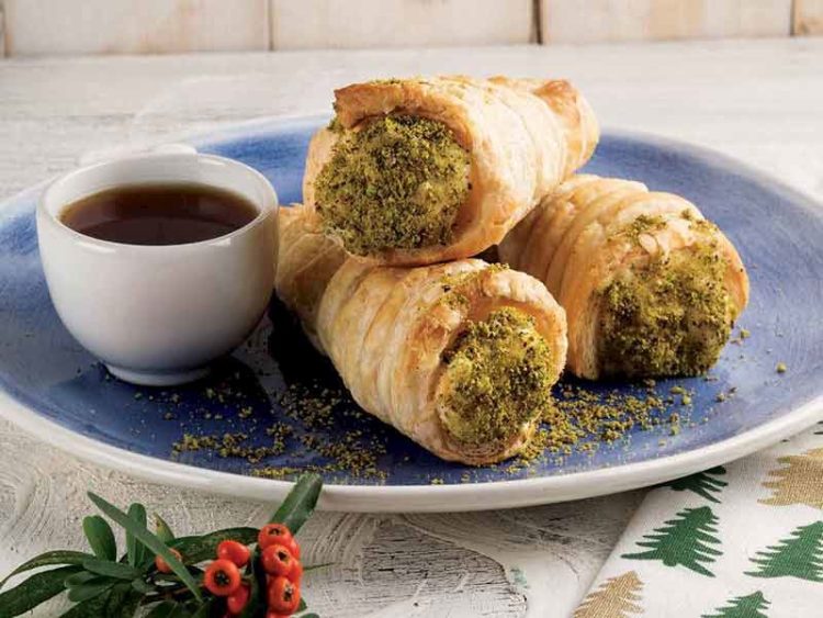 11. Muhallebili kısımlarını toz Antep fıstığına batırarak servis yapın..