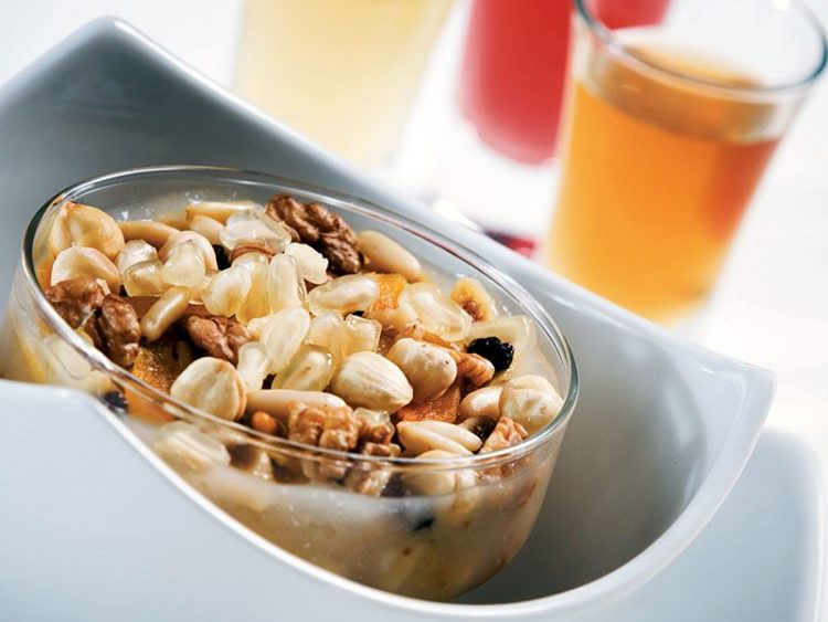 - Tatlılar soğuduktan sonra üzerlerini tarçın, nar, ceviz içi ve dolmalık fıstık ile Saray Usulu Aşureyi süsleyerek servis yapın..