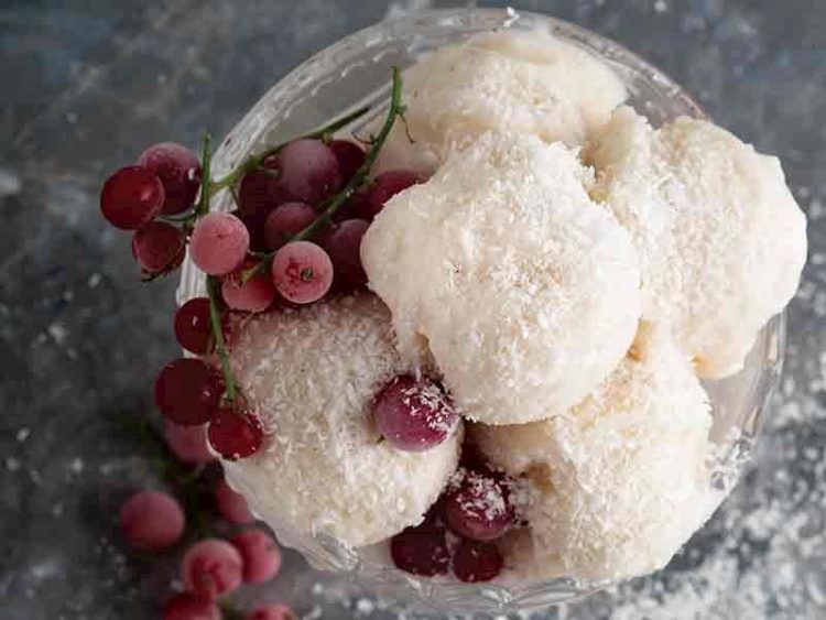 - Frenk üzümü ve Hindistan cevizi ile süsleyerek servis yapın..