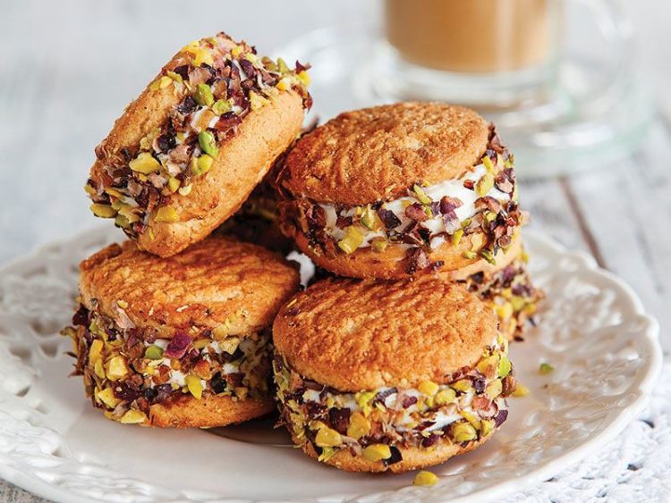 dondurma yerleştirin.. - Bisküvilerin kenarını ince kırılmış Antep fıstığına bulayın..