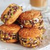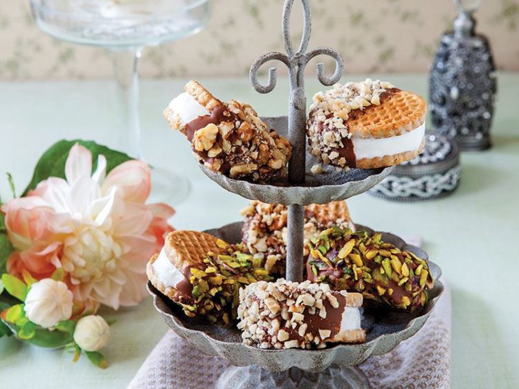 - Arasına dondurma koyduğunuz bisküvilerin yarısını çikolataya batırın ve ardından çekilmiş ceviz içi, fındık ve file fıstığa bulayın..