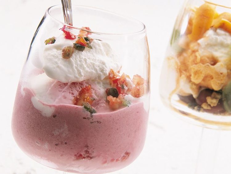 - Çilekli kupu çilekli dondurma, meyve şekerlemesi, ahududu ve krema ile hazırlayın..
