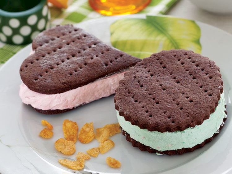 - Soğuduktan sonra iki kurabiye arasına çilekli ve antep fıstıklı dondurma paylaştırıp kapatın..