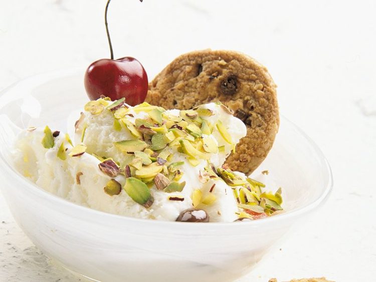 5. Üzerlerine dondurmayı ekleyip antepfıstığı serpin ve damla çikolatalı bisküvi ile servis yapın..
