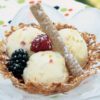 Meyve karışımını kuplara paylaştırıp üzerlerine birer top vanilyalı dondurma yerleştirin..