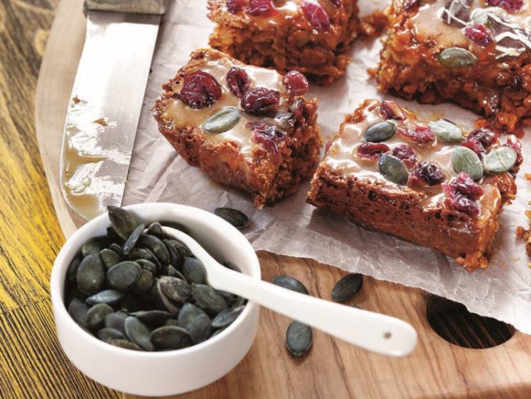 Yaban mersinli, kabak çekirdekli karamelli bar