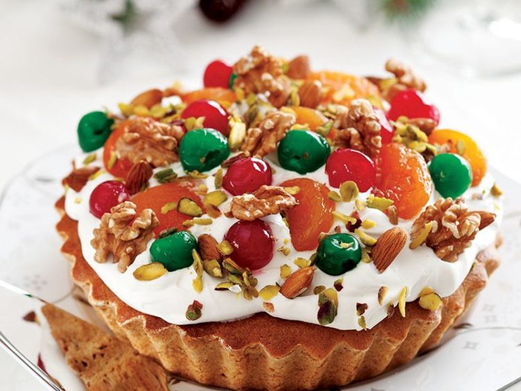 12. Kayısıları, fıstığı, cevizi, bademi, kiraz şekerlemelerini kremanın üzerine hafifçe batırarak yerleştirin..