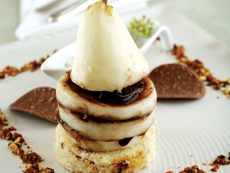 6. Üst üste dizilmiş armut dilimlerini bütün olarak yuvarlak kestiğiniz kek diliminin üzerine yerleştirip servis tabağına alın..