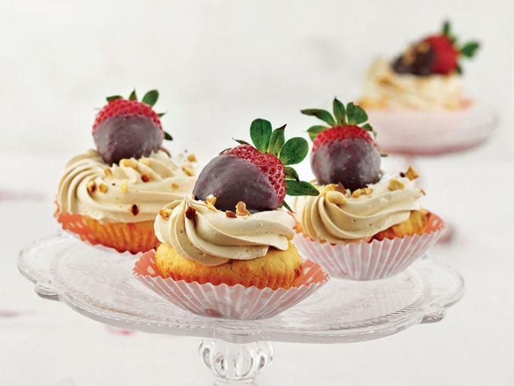 keklerin üzerine sıkın.. - Çikolatalı çilekleri üzerine yerleştirin ve fındık parçaları ile süsleyin..