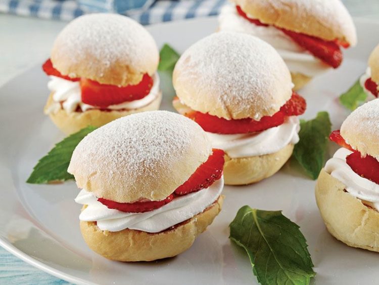 - Soğuyan pufları enlemesine ortadan ikiye kesin ve alt parçaya çilek reçeli sürün..