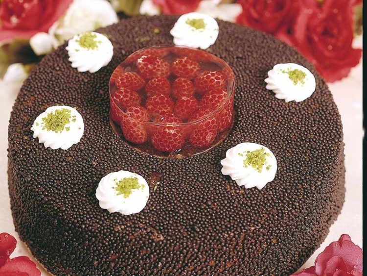 13. Granül çikolata ile pastanın tamamını kaplayıp kremşanti ve jölede dondurulmuş frambuazla süsleyin..