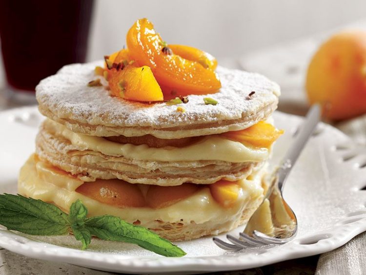 8. Milföylerin arasına krema sürüp ince dilimlenmiş kayısıları yerleştirerek 3 kat olacak şekilde üst üste dizin..