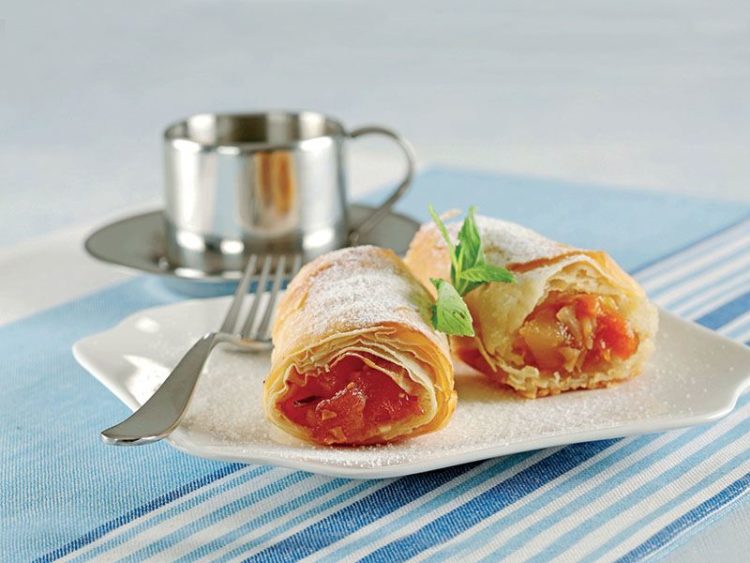 8. Kayısılı karışımı yufkaların üzerine şerit şeklinde yerleştirin ve rulo şeklinde sarın..