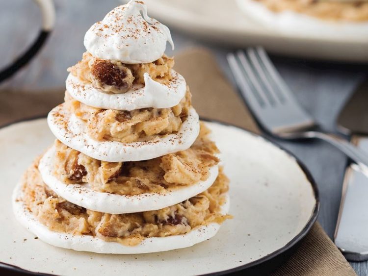 - Merengleri aralarına kestane kreması sürerek kat kat dizin..