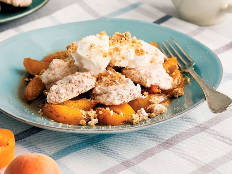 - Üzerlerine birer Hindistan cevizli kurabiye, birer kaşık kaymak ve toz haline getirdiğiniz yulaflı bisküviden serpip ılık servis yapın..