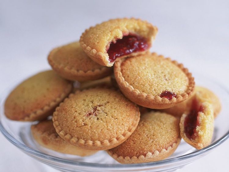 - Fırından çıkarıp (fırının ısısını kapamayın) ılınmaya bırakın ve ahududu marmeladından birer tatlı kaşığı tartöletlerin içine paylaştırın..