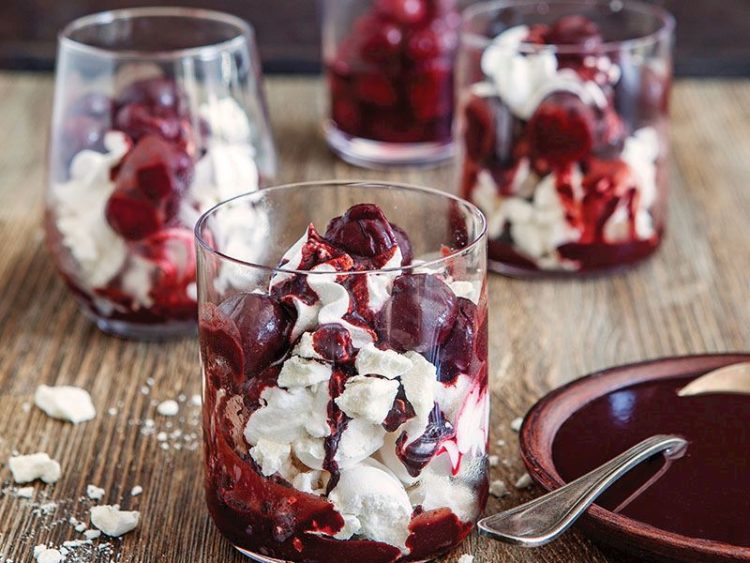 15. Merengi servis bardaklarının yarısına kadar gelecek şekilde eşit olarak bölün ve üzerine vişneli sostan ekleyin..