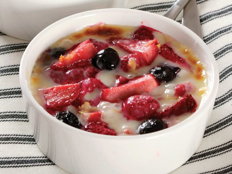 - Küp doğradığınız çilekler, frambuaz ve yaban mersinini geniş bir kasede harmanlayıp ısıya dayanıklı servis kaplarına paylaştırın..