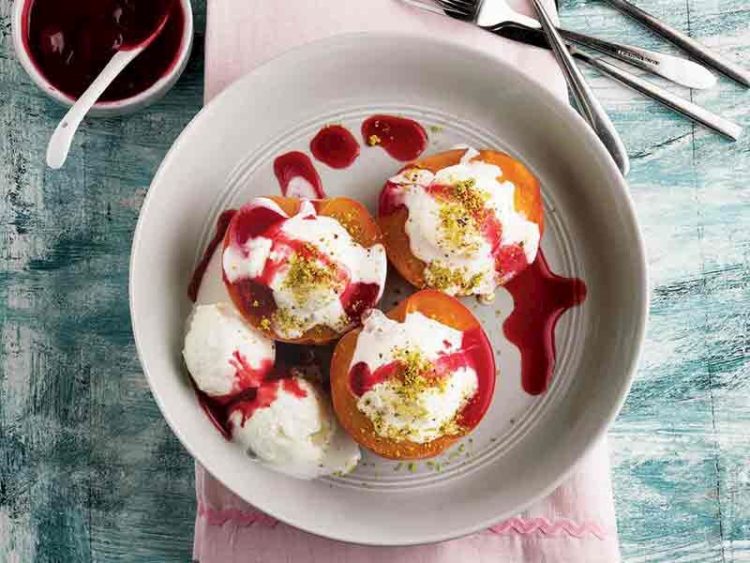 - Şeftalileri, kesik tara arı yukarı gelecek şekilde servis tabağına yerleştirin..