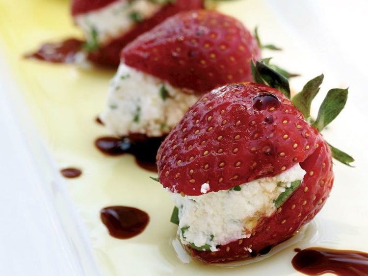 Taze kekikle karıştırılmış labne peynirini çileklerin arasına doldurun..