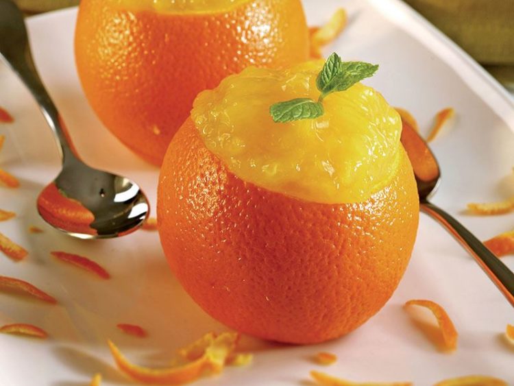 4. İçi oyulmuş portakallara doldurup nane yapraklarıyla süsleyerek servis yapın..
