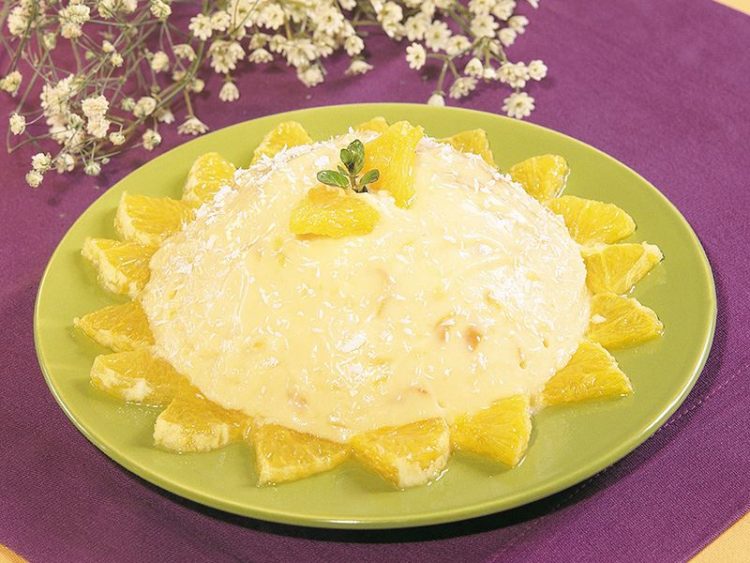 - 1 su bardağı portakal suyu 2 çorba kaşığı rendelenmiş portakal kabuğu 4 yumurta sarısı 1 su bardağı tozşeker 2 yaprak jelatin 1 su bardağı süt kreması Süsleme için: 2 portakal 1 su bardağı tozşeker 8 çorba kaşığı su Hindistancevizi rendesi