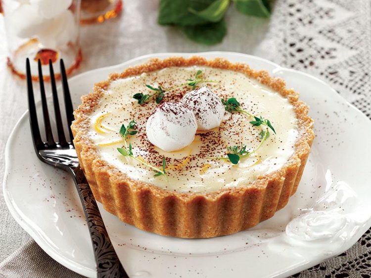 9. Buzdolabında en az 2-3 saat soğuttuktan sonra üzerini taze kekik, mini mereng ve kakao ile süsleyerek servis yapın..