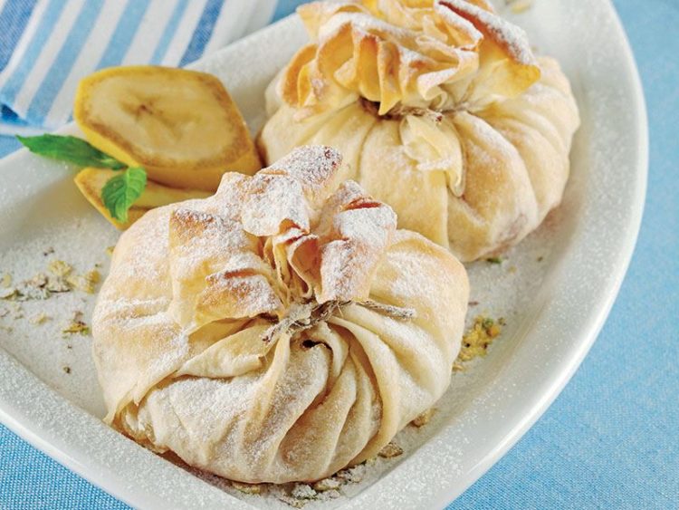 10. Ortalarına meyveli karışımdan paylaştırıp bohça yapın ve fırın ipiyle bağlayın..