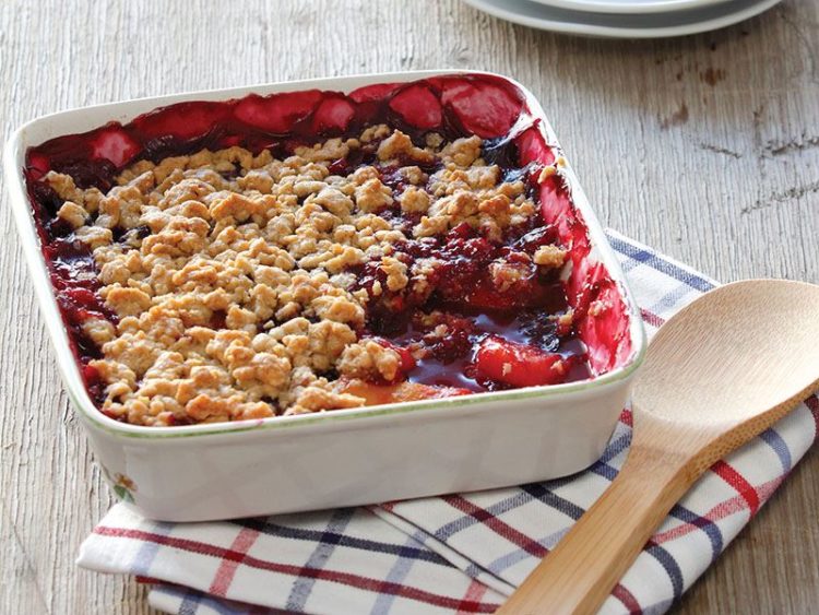 - Ufalanmış bisküvi harcını meyvelerin üzerine serpin..