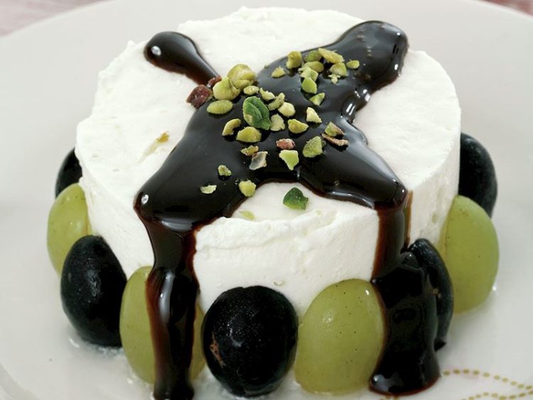 - Üzümleri uzunlamasına ortadan ikiye kesin ve tatlının çevresine dizin..