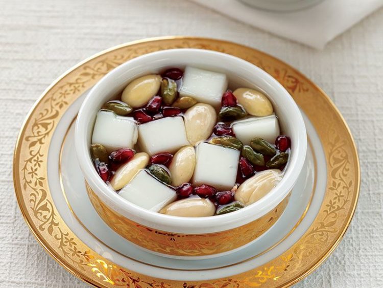 8. Küp doğranmış muhallebi, kayısı, nar, badem ve fıstık ekleyip hafif karıştırın ve servis yapın..