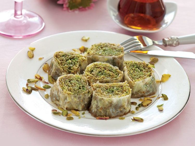 - Son olarak 200 gr antep fıstığı serpip rulo şeklinde sarın..