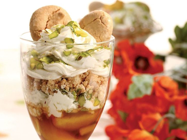 - Karamelize edilmiş şeftali dilimlerini sosuyla birlikte servis kadehlerine paylaştırın..