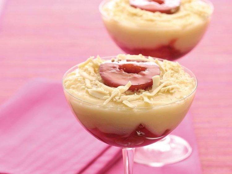 - Servis bardaklarına sırasıyla kırmızı erikli karışım ve ılınmış muhallebiyi paylaştırın..