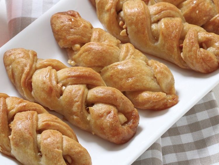 - Orta kısmına fındık yerleştirin ve kenardaki parçaları üst üste gelecek şekilde kapatarak örgü şekli verin..