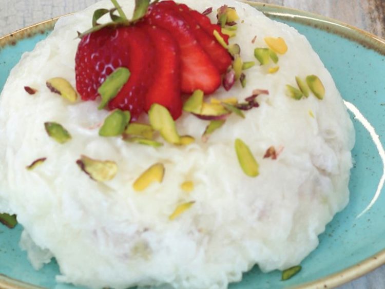 - Kaseleri ters çevirip üzerlerini dilimlenmiş çilek ve iri kırılmış Antep fıstığı ile süsleyerek servis yapın..
