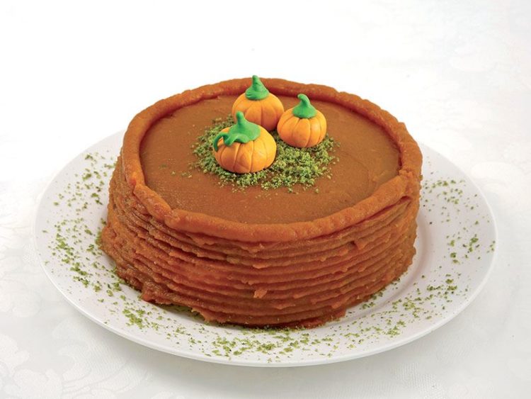 - Pastanın üzerini toz fıstık ve şeker hamurundan yapılmış balkabakları ile süsleyerek servis yapın..