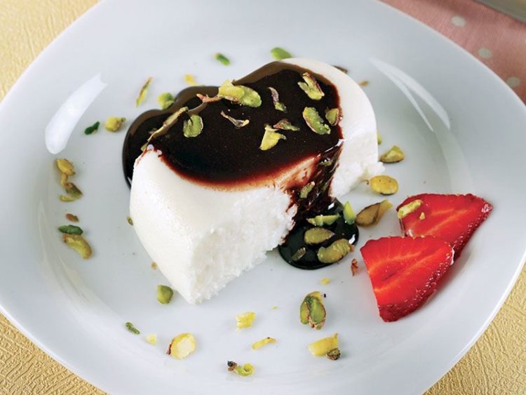 - Üzerine çikolata sos döküp Antep fıstığı ve çilekle süsleyerek servis yapın..