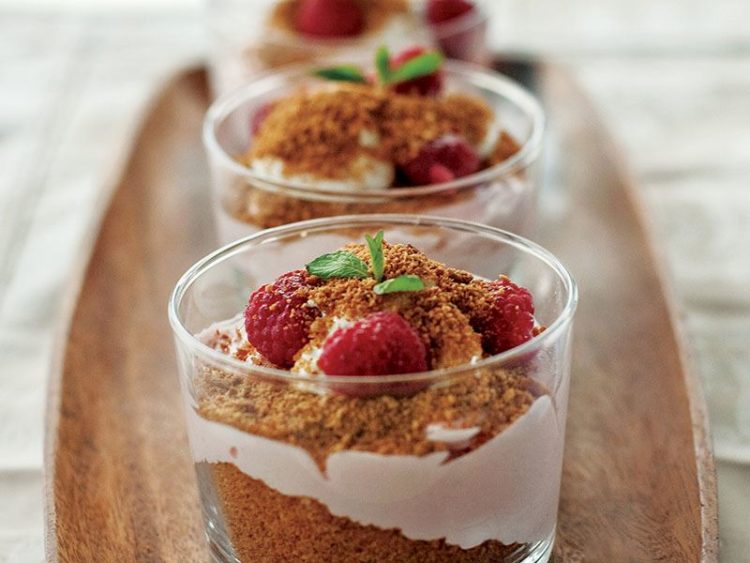 - En az 3 saat buzdolabında beklettikten sonra birer kaşık çırpılmış krema ekleyip frambuaz, kalan toz bisküvi ve nane yapraklarıyla süsleyip servis yapın..