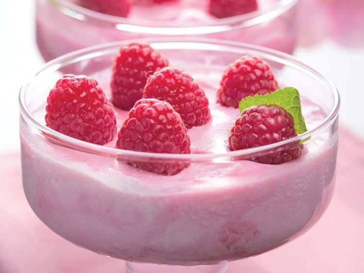 - Frambuaz püresini yoğurt karışımına ekleyip karıştırın ve servis kaselerine paylaştırın..