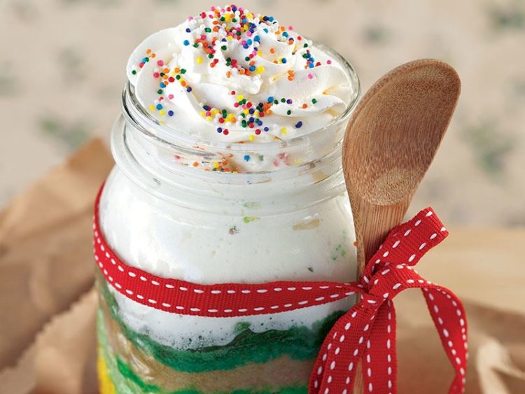 6. Hamuru birkaç kaseye paylaştırıp gıda boyaları ile renklendirin ve yağlanmış kavanozlara 2/3’ü dolacak ve her kat farklı renkte olacak şekilde doldurun..