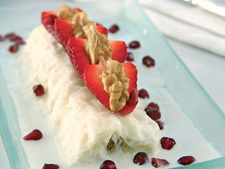 8. Üzerini dilimlenmiş çilek, ceviz içi ve nar taneleriyle süsleyip servis yapın..