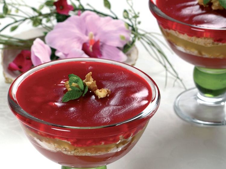 - *Küçük bir tencerede nar suyu, 1 yemek kaşığı şeker ve 1 yemek kaşığı nişastayı kaynatıp servis yapacağınız kadehin 1/3’ini dolduracak şekilde aktarıp soğumaya bırakın..