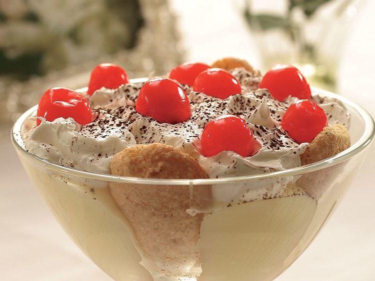 - Kuplara paylaştırıp üzerini kiraz şekerlemeleriyle süsleyin ve kakao serpin..