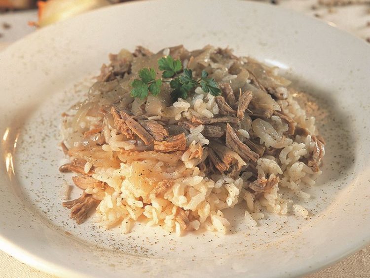 - 1 kg pirinç500 gr kemiksiz et3 soğan2 çorba kaşığı margarinKaynar et suyuTuz
